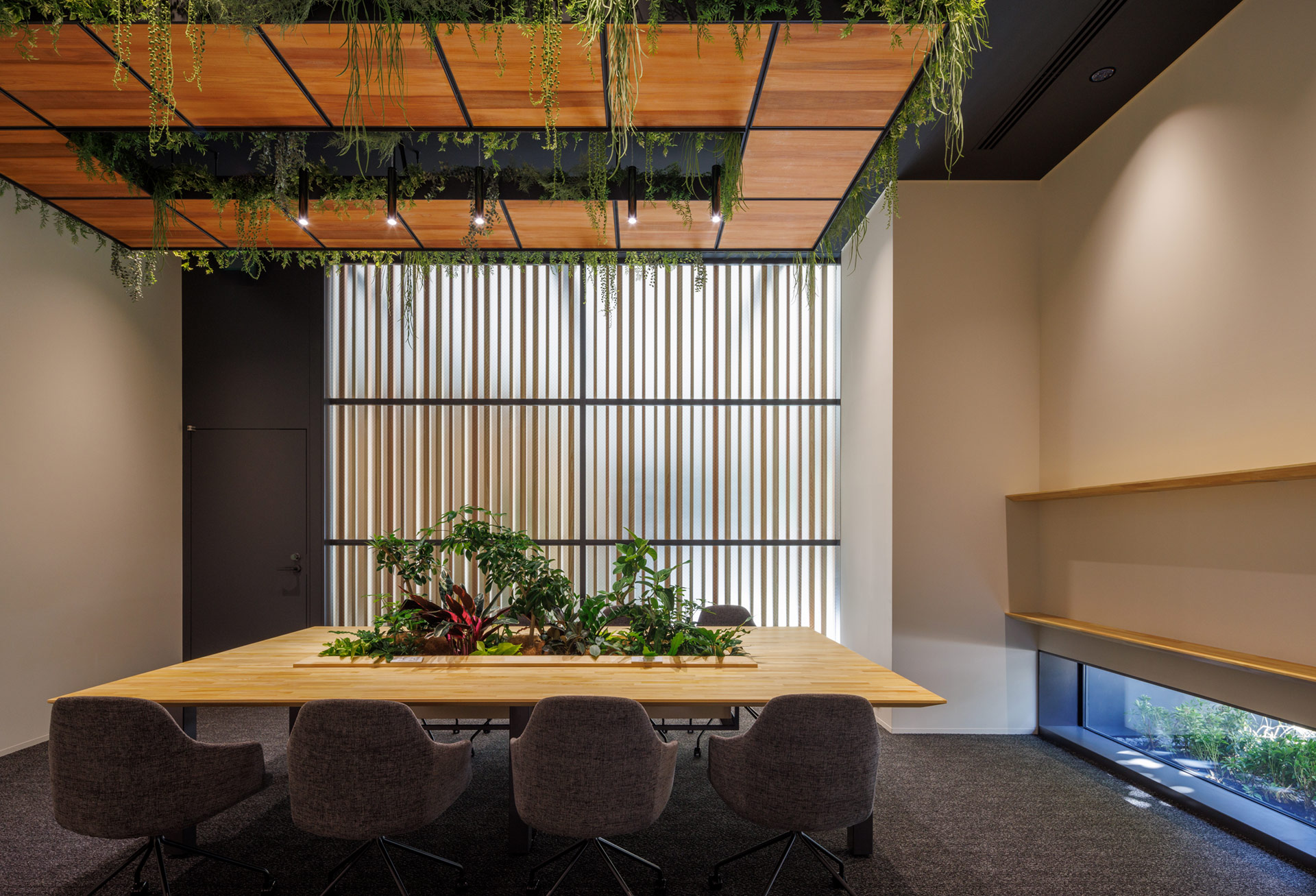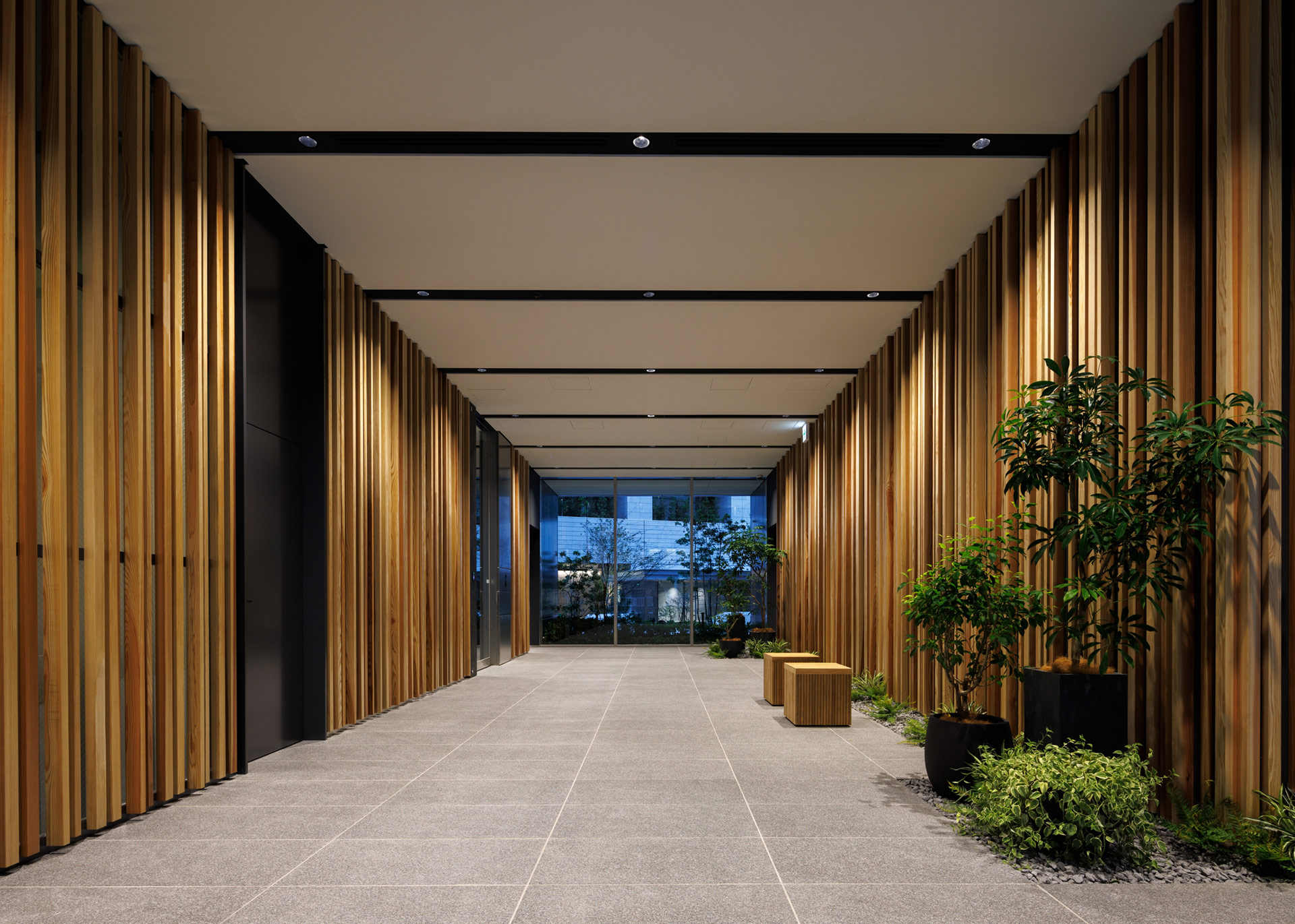 都心部における高層木質テナントオフィス。敷地を高密度に利用しているため、外構の緑地は限られており、その多くが雨掛かりのない植栽帯となっています。インテリアの延長上としての軒下空間を作り出すため、各樹木のスケール感に配慮し、また日照条件の類似する環境で育ったイロハモミジなどを選定することで、植物の抵抗を緩和しました。目線の下の低木にもさまざまなテクスチャーの常緑樹を混ぜ、リジットなファサードから導かれるエントランス部に柔らかさを与えています。屋外のみならず、1階共用部の屋内植栽のデザインにあたっては、自然植物と人工植物を組み合わせ、木の立面と調和する緑としました。